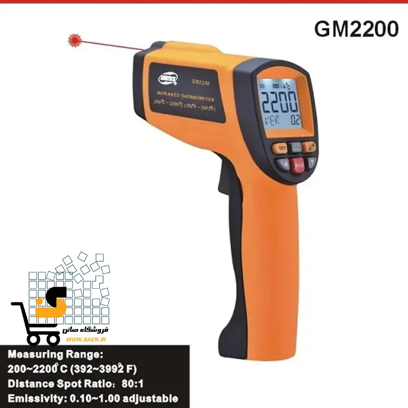 دماسنج لیزری صنعتی بنتک BENETECH GM2200 با رنج وسیع ‌۲۰۰ تا ۲۲۰۰ درجه سانتی‌گراد، سرعت اندازه‌گیری بالا و قابلیت ذخیره‌سازی داده، مناسب برای محیط‌های صنعتی و کوره‌ها.